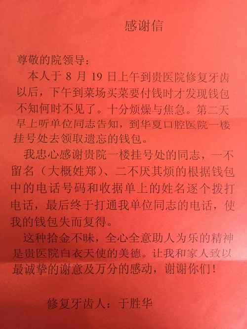 拾金不昧是中华民族的传统美德,也是一个人道德风尚和崇高社会责任感的具体体现。近日,我院挂号处工作人员郑晓敏在挂号收费时捡到一个女士钱包,郑晓敏同志急人所急,在第一时间想到肯定是病人缴费时忘记拿了,得赶紧联系失主,归还钱包。通过钱包里存放的电话号码和医院收据上的信息,终于联系到了失主,并将钱包完好归还。当失主拿到失而复得的钱包,感动不已,向郑晓敏同志表达了诚挚的感谢,同时对苏州市华夏口腔医院表达了深深的敬意,专程到院领导处送来了一封感谢信。