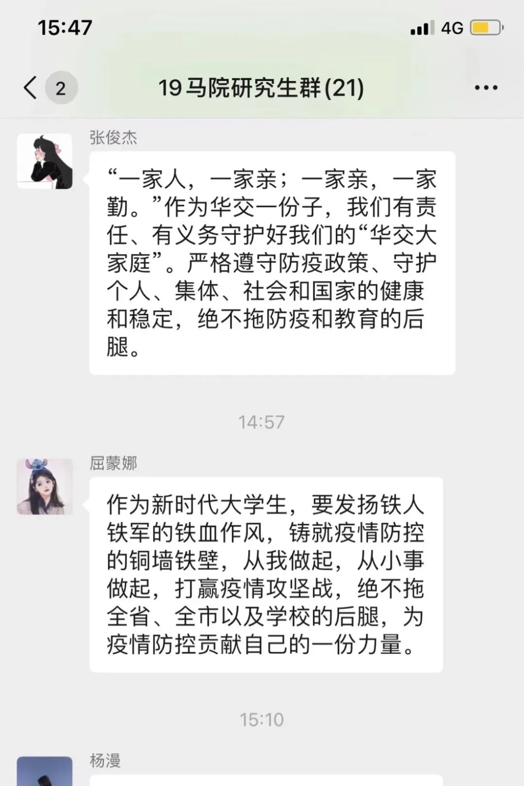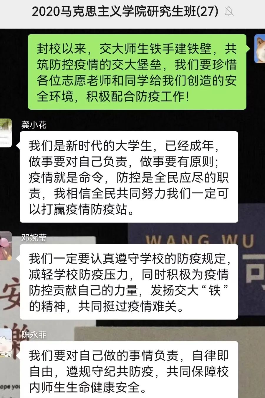 疫情防控是一场保卫人民群众生命安全和身体健康的严峻斗争。在当前疫情反反复复的情形之下,作为一名中共党员与当代研究生,更应该谨遵规定,守护好我们的小家园,才是为中国这个大家园的抗疫工作做出贡献。同时,我也坚信,只要全国各族人民心往一处想,劲往一处使,万众一心,众志成城,全国人民的智慧和力量就能汇集成不可战胜的磅礴力量,战胜困难,战胜疫情。