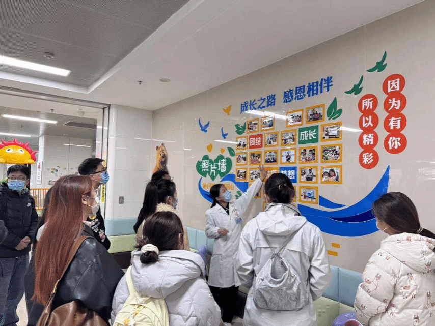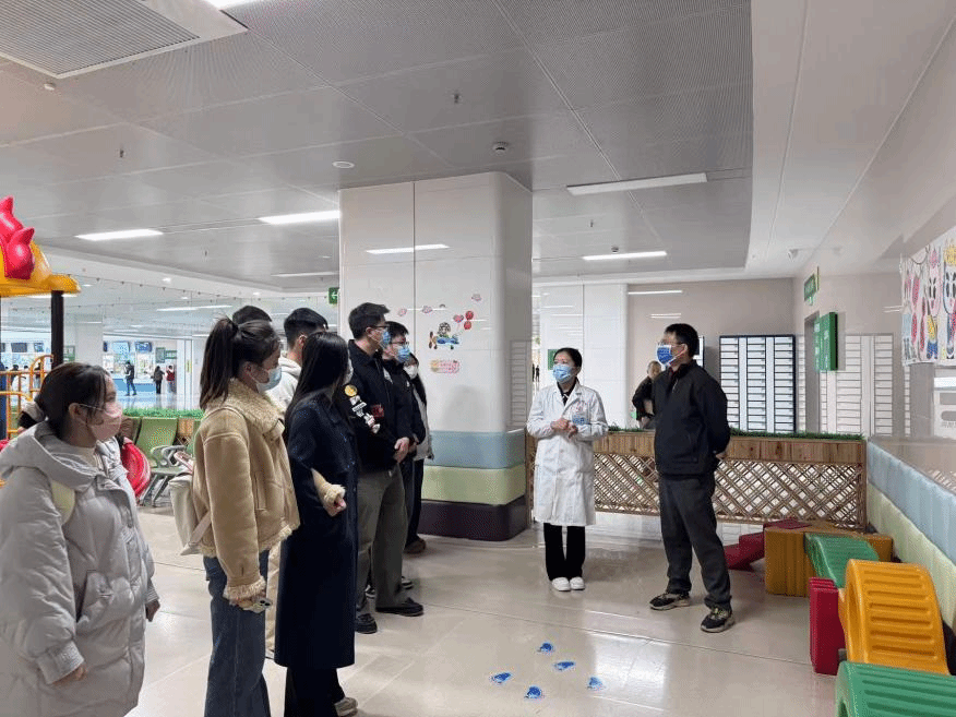 师生一行在工作人员何老师的陪同下参观了医院与北京新阳光慈善基金会合作的公益项目和南青基金的结疗项目、博爱社工服务站等多个实务平台。何老师详细介绍了各项目的运作机制、服务内容与实际成效,重点讲解了医务社工如何通过系统干预,为患儿及其家庭提供从治疗到康复的全周期支持,助力他们重建生活信心、顺利回归社会。值得一提的是,为保障住院患儿教育的连续性,医院特别设立“病房学校”,广泛链接社会志愿者资源,于每周固定时间为在院儿童开展课程教学与陪伴活动,有效缓解了患儿因长期住院而产生的社会脱节与心理压力。