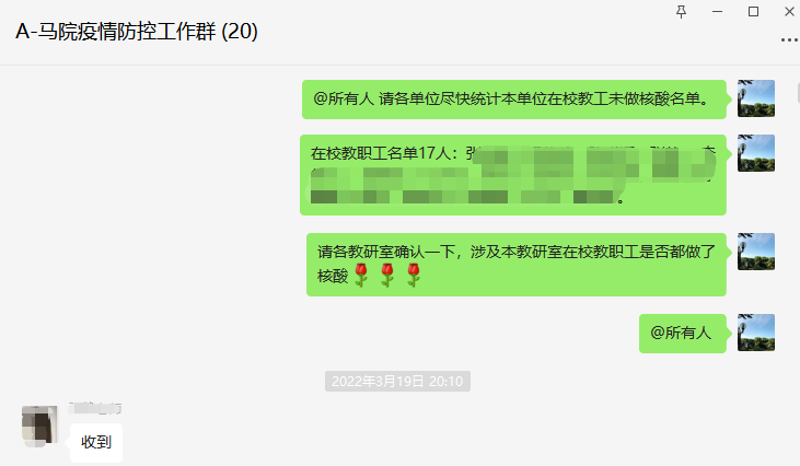 坚守阵地靠前指挥,引领示范同心战“疫”。本轮疫情发生后,校党委迅速作出“校园封闭管理”的部署安排,正在学院加班的张剑锋决定驻守学院,贯彻落实校党委疫情防控工作要求,自觉肩负起作为学院疫情防控工作第一责任人的重任,同全院师生一道共克时艰。作为学院党政一肩挑的他,面对来势汹汹的疫情,想在前,干在前,从早从严从细抓好疫情防控工作,当好“领头雁”,守好“责任田”,动员全院师生自觉遵守各项防疫规定,鼓励师生积极参与校院两级防疫工作,同心同行共同打好疫情防控的阻击战。