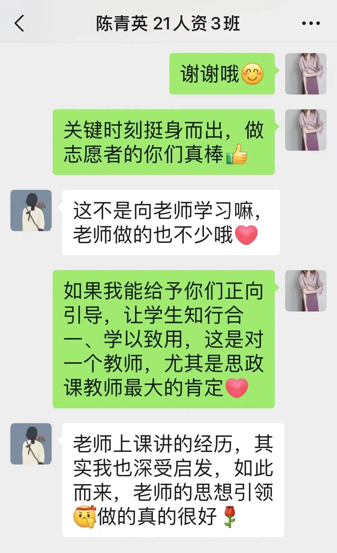 作为一名《思想道德与法治》课教师,她认为教学不止于课堂,学习也不限于课本,“把思政小课堂同社会大课堂结合起来”,使现实生活成为思政课的丰富源泉,这样的“大思政课”才会更加鲜活,直抵人心。为了讲好“抗疫思政”,讲好华交故事,她及时调整课件,以小见大,从华交抗疫的身边人、身边事着手,到全国上下一条心的抗疫大局,引导学生在观察思索中选择、实践,成长为担当民族复兴大任的时代新人。在她本学期的教学班级中,有15位大一学生担当抗疫志愿者,关键时刻站得出来、顶得上去,用实际行动诠释了当代青年最好的样子。