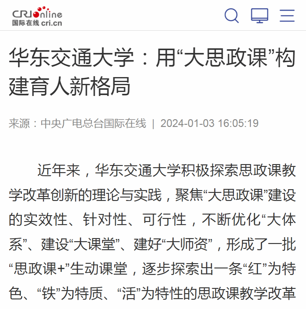 华东交通大学积极探索思政课教学改革创新的理论与实践,聚焦“大思政课”建设的实效性、针对性、可行性,不断优化“大体系”、建设“大课堂”、建好“大师资”,形成了一批“思政课+”生动课堂,逐步探索出一条“红”为特色、“铁”为特质、“活”为特性的思政课教学改革创新之路。