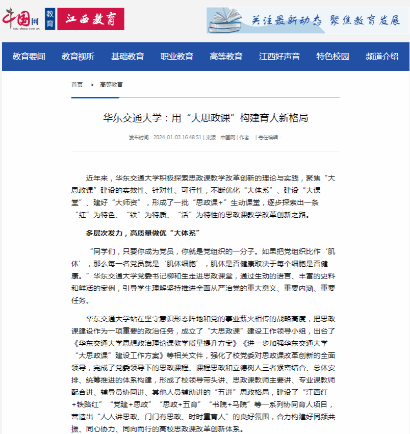 华东交通大学积极探索思政课教学改革创新的理论与实践,聚焦“大思政课”建设的实效性、针对性、可行性,不断优化“大体系”、建设“大课堂”、建好“大师资”,形成了一批“思政课+”生动课堂,逐步探索出一条“红”为特色、“铁”为特质、“活”为特性的思政课教学改革创新之路。