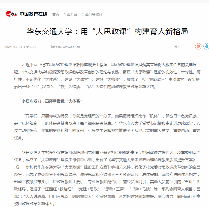 华东交通大学积极探索思政课教学改革创新的理论与实践,聚焦“大思政课”建设的实效性、针对性、可行性,不断优化“大体系”、建设“大课堂”、建好“大师资”,形成了一批“思政课+”生动课堂,逐步探索出一条“红”为特色、“铁”为特质、“活”为特性的思政课教学改革创新之路。