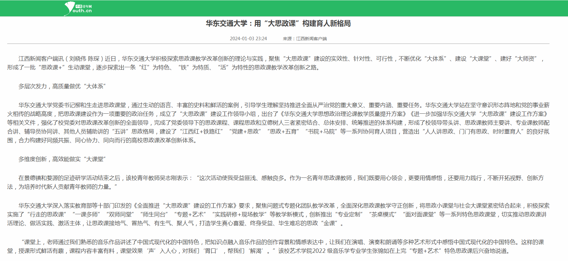 华东交通大学积极探索思政课教学改革创新的理论与实践,聚焦“大思政课”建设的实效性、针对性、可行性,不断优化“大体系”、建设“大课堂”、建好“大师资”,形成了一批“思政课+”生动课堂,逐步探索出一条“红”为特色、“铁”为特质、“活”为特性的思政课教学改革创新之路。