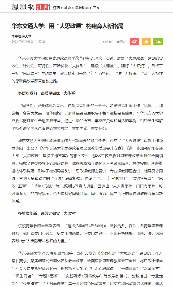 华东交通大学积极探索思政课教学改革创新的理论与实践,聚焦“大思政课”建设的实效性、针对性、可行性,不断优化“大体系”、建设“大课堂”、建好“大师资”,形成了一批“思政课+”生动课堂,逐步探索出一条“红”为特色、“铁”为特质、“活”为特性的思政课教学改革创新之路。