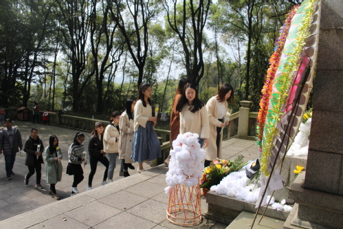 研究生们排着整齐的队伍,怀着无比崇敬的心情,进入方志敏烈士陵园,大家一同瞻仰了方志敏烈士铜像并前往烈士墓前进行祭扫。接着,宋文迪同学主持并介绍方志敏烈士事迹,在了解方志敏感人的事迹后,大家进一步加深了对方志敏烈士的敬仰之情。随后,研究生们依次向方志敏烈士墓献花、向烈士墓鞠躬默哀并集体诵读方志敏同志的作品《可爱的中国》,以表达对革命烈士的崇高敬意和深深怀念。