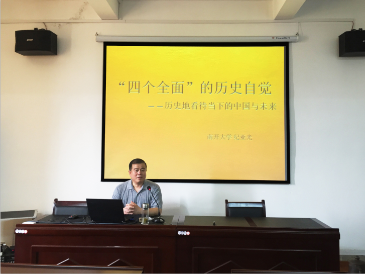 2016年5月27日下午南开大学马克思主义学院院长纪亚光教授受邀来我院开展主题为 “‘四个全面’的历史自觉——历史地看待当下的中国与未来”的学术报告,报告会在马克思主义学院306会议室举行。此次报告会不但是学术的交流,更是一堂生动的党课,是我院“两学一做”系列活动内容之一,全部党员、全体教职工及部分研究生听取了此次报告。