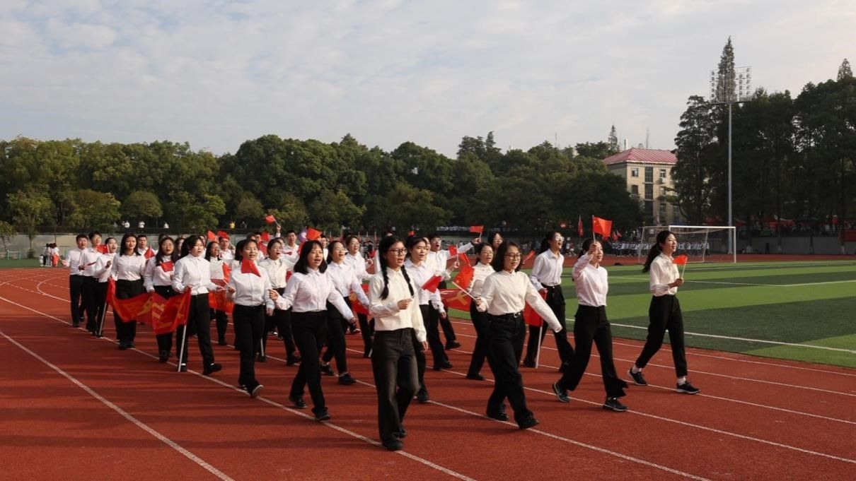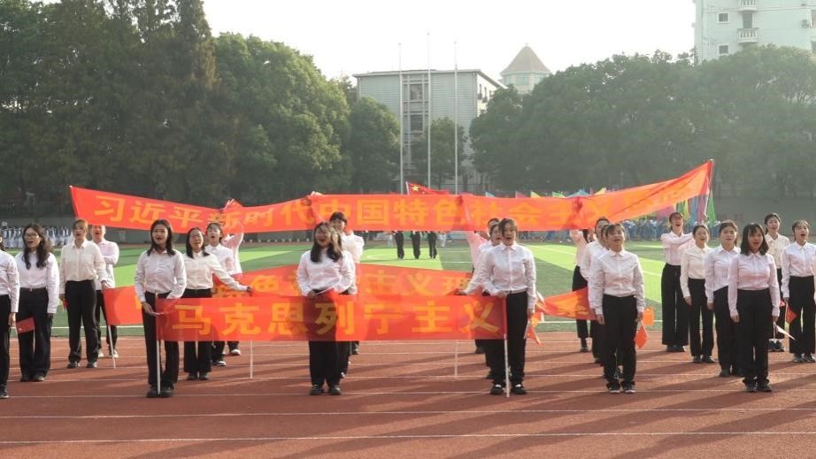操场上彩旗飘扬,各学院方阵队迈着整齐的步伐,昂首阔步走向主席台。马克思主义学院方队高举院旗,动作整齐划一,伴随“马院姓马,在马言马,一马当先,一往无前”口号,师生们一同接受主席台检阅。