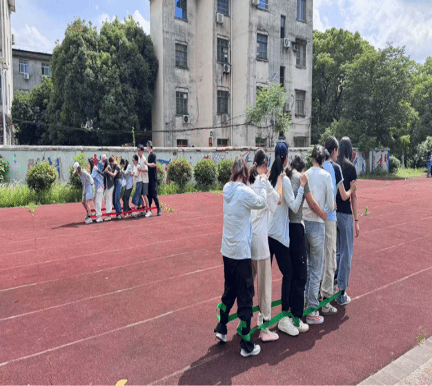 在“同心协力”项目中,大家紧握手中的绳索,齐声高喊口号,排球在鼓面上有规律地跳动着,“一、二,一、二……” 队员们的口号声坚定而有力。